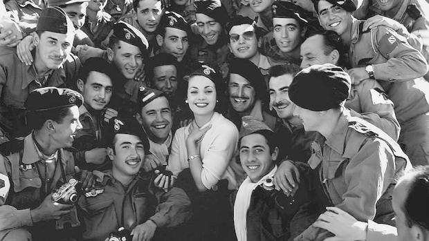 Carmen Sevilla apoyando a las tropas españolas en Sidi-Ifni, Marruecos, donde actuó para ellos en 1957, durante la última guerra que España libró con otro país.