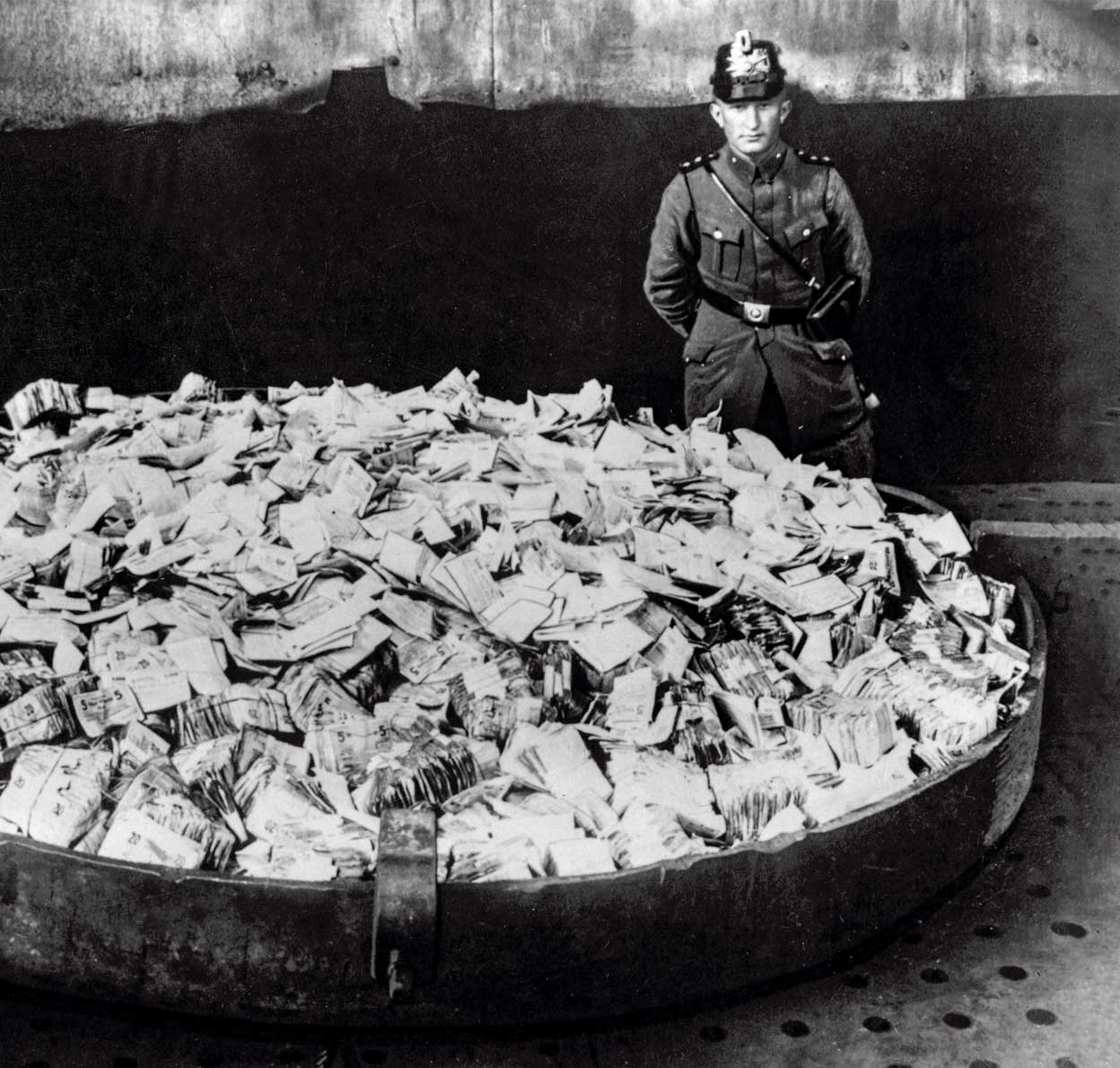 Si en enero de ese año una barra de pan costaba 250 marcos, nueve meses después su preció se había disparado a 200.000 millones de marcos. Era más barato quemar billetes en la estufa que usarlos para comprar carbón. Eso muestra, de hecho, la imagen superior,