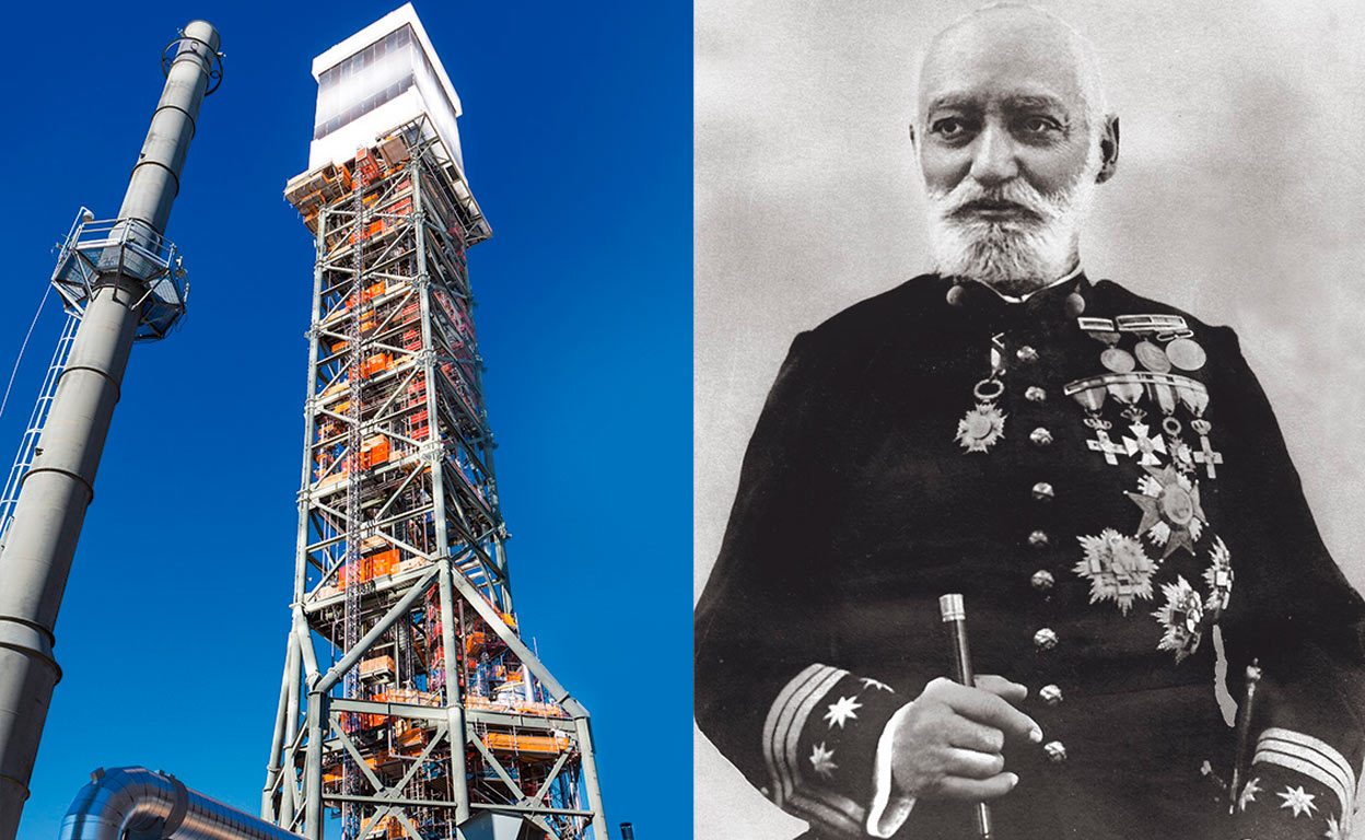 Isidoro Cabanyes y, a la izquierda, una de las torres solares que soñó, hoy hecha realidad.
