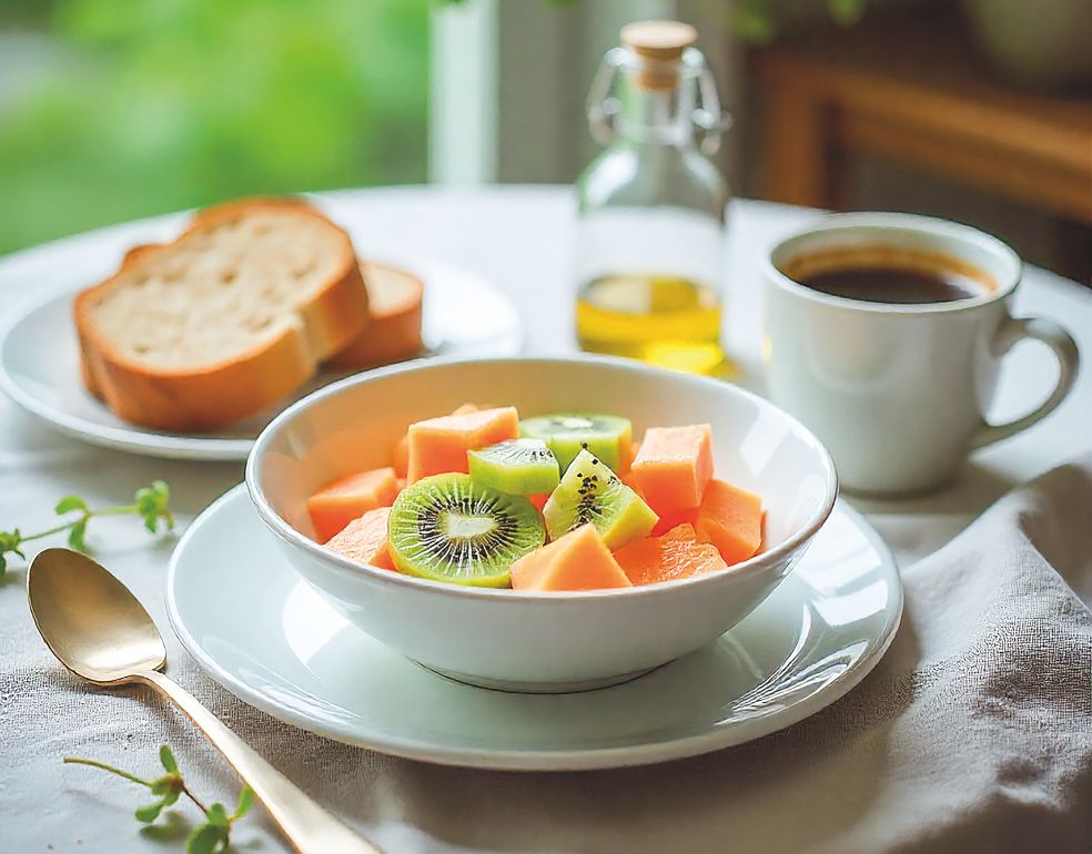 «Un bol con kiwi, manzana, papaya con lima… Y un café casi negro con leche