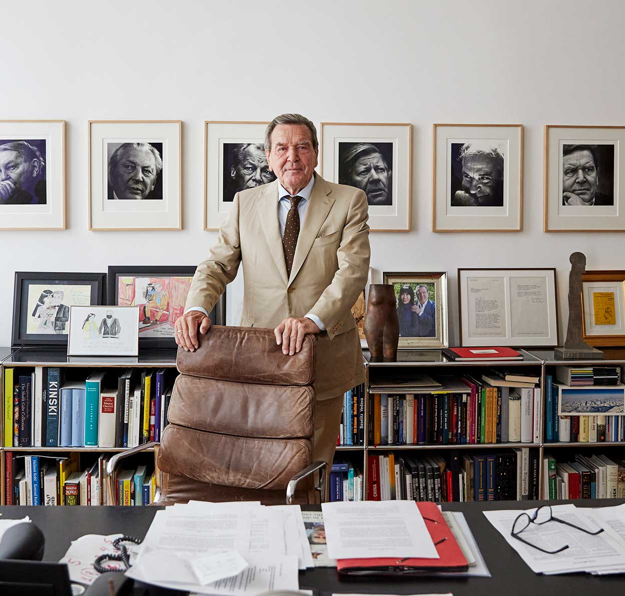 El excanciller tiene un regalo para sus invitados: una taza con su perfil. Guarda un montón de ellas en el sótano. Cuenta que cuando el SPD las retiró de la tienda del partido, su mujer las compró todas. A pesar de todo, seguirá votando al SPD lo que le queda de vida, asegura Schröder con una sonrisa.