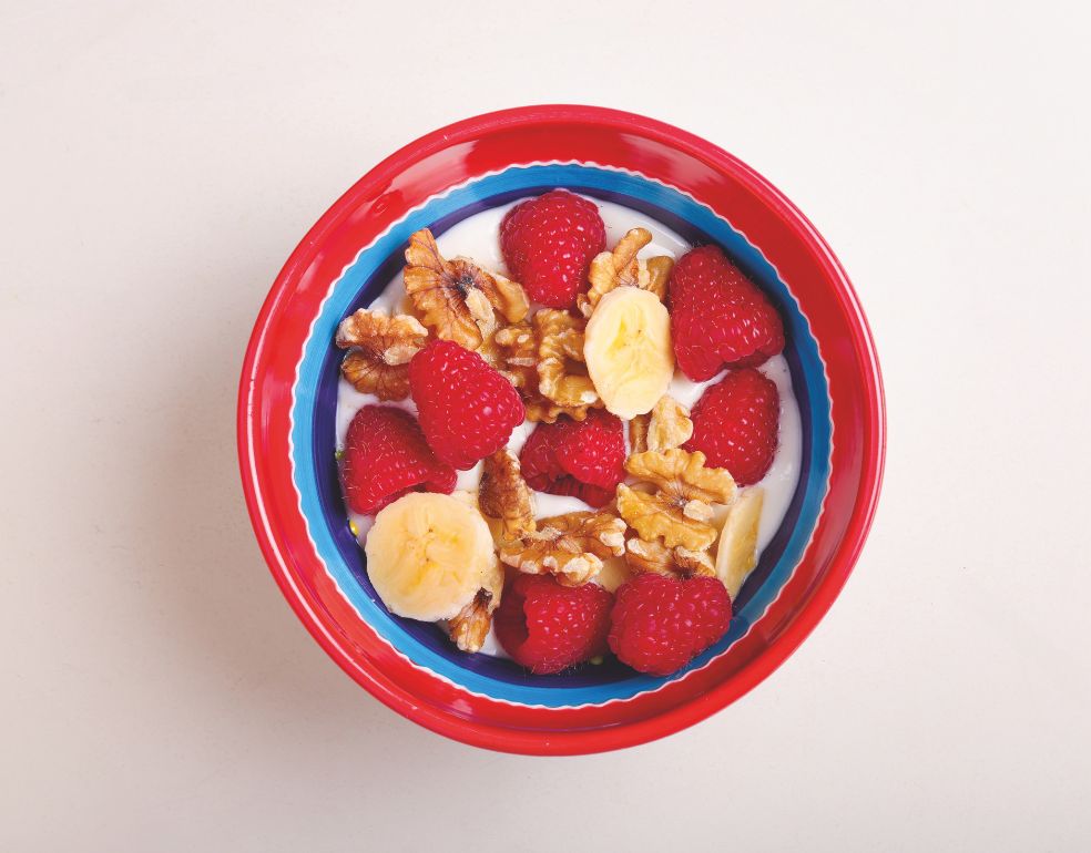 «Mezclo en un bol un yogur natural con trozos de plátano, fresas, manzana, frambuesas y nueces. Y, aparte, un café con leche».