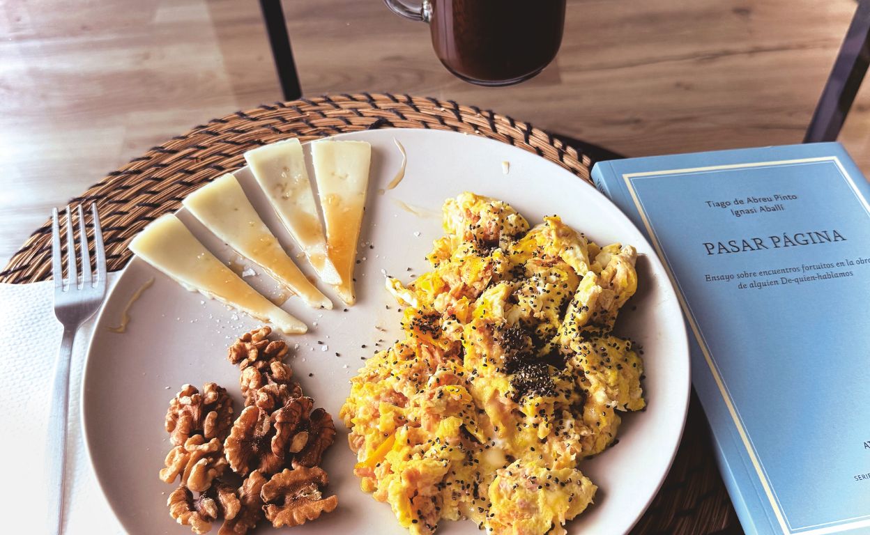 «Un café con proteína de suero de leche; tres huevos revueltos con atún, queso Havarti y semillas de chía; y algo de queso de cabra, nueces y miel de roble».